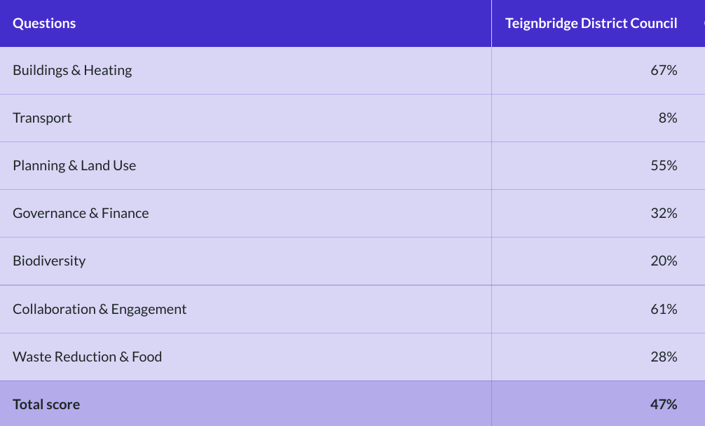 Councils are scored for the action they have taken in seven areas, with the two most influential in the scoring for district councils being Buildings & Heating and Planning & Land Use. Teignbridge scored well above average for both of those. It performed worst in the Transport section, with a below average score of 8%, although the average was only 9%, so transport is clearly a problem area for many councils.