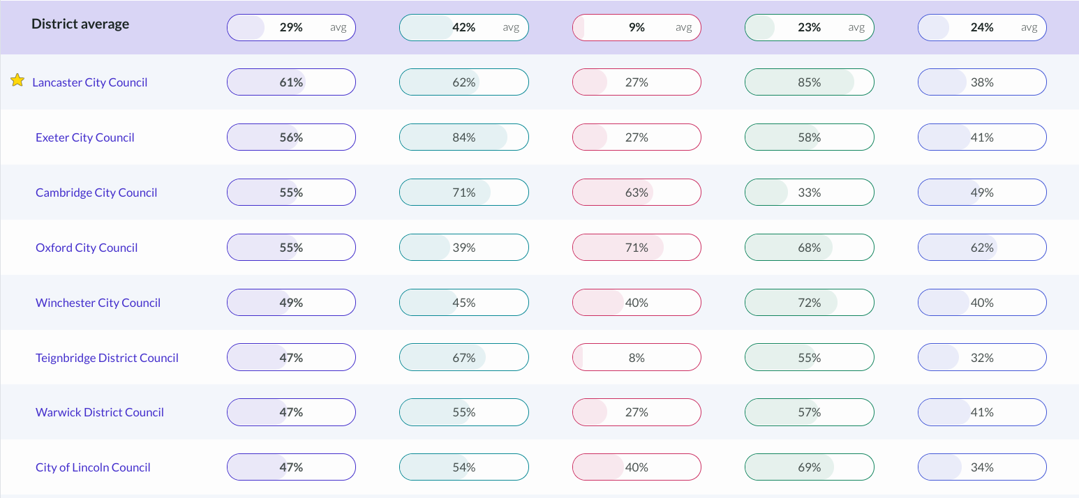 Devon County Council also scored well, coming third in the county council section with 50%. The top scorer in that section is Oxfordshire (53%). Devon did particularly well in the Buildings & Heating and Collaboration & Engagement sections.